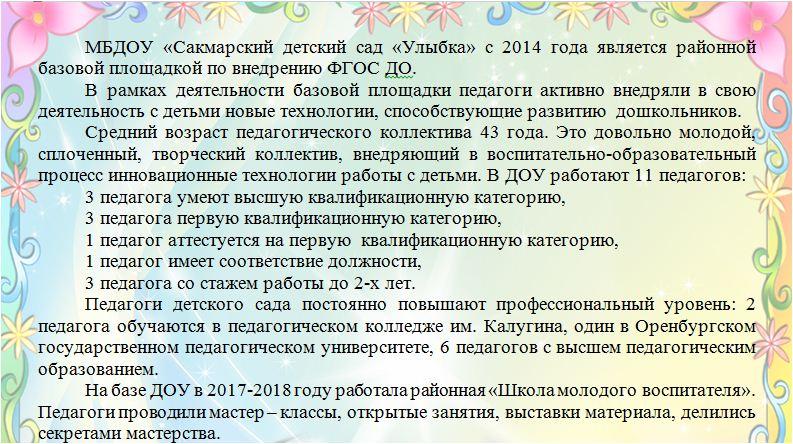 В 2003году преобразован в Муниципальное дошкольное образовательное учреждение «Сакмарский детский сад «Улыбка», распоряжение Администрации Сакмарского района № 37-р от 15.01.2003г.